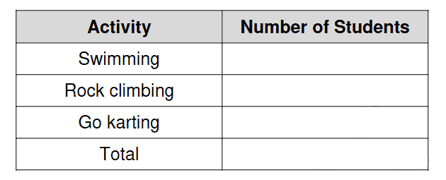 4 point(s)Category: CalculatorActivity Number of Students Swimming Rock climbing Go karting Total CorrectIncorrect -